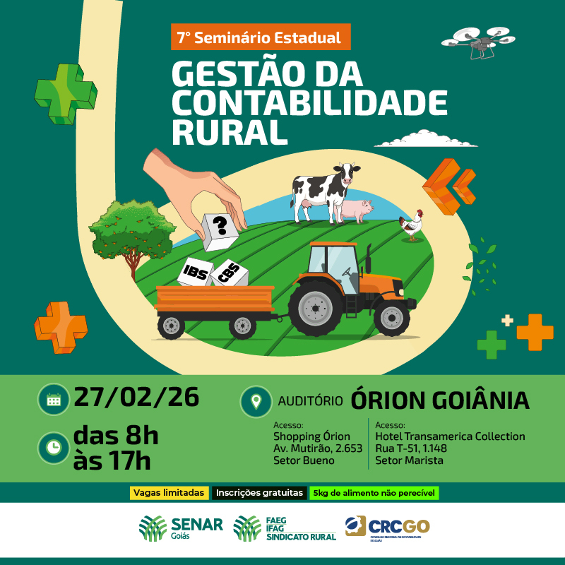 O Serviço Nacional de Aprendizagem Rural em Goiás (Senar Goiás) realiza, nesta sexta-feira, 27 de fevereiro, o 7º Seminário Estadual de Gestão da Contabilidade Rural. O evento é promovido em parceria com o Conselho Regional de Contabilidade de Goiás (CRC-GO) e tem como objetivo aprimorar o atendimento aos produtores e às empresas rurais, além de ampliar as oportunidades para contadores, advogados e demais prestadores de serviços especializados.